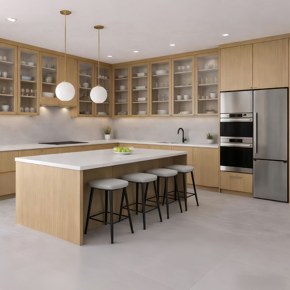 Perfect for modern homes, luxury condos, and upscale remodels, Natural Oak frameless cabinetry delivers European elegance, natural warmth, and everyday durability—a sophisticated foundation for a modern kitchen designed to last.