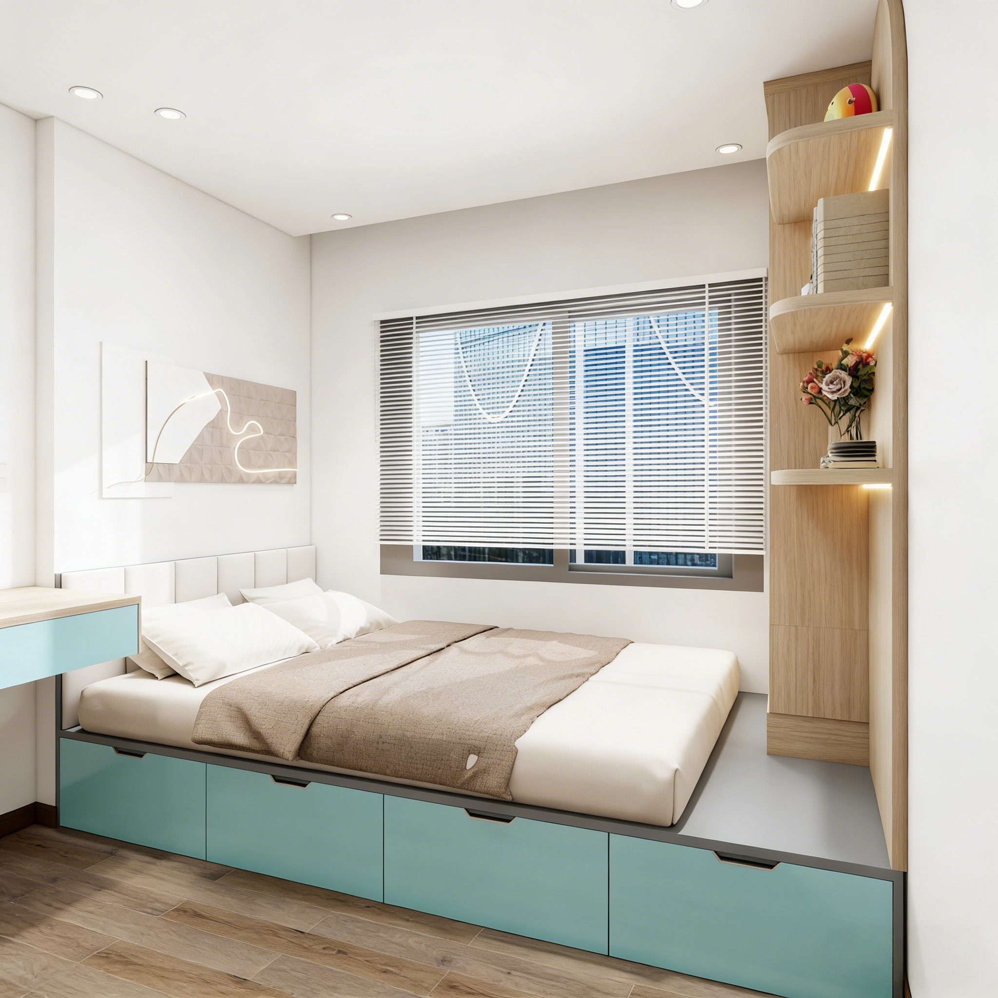 The bed base features built-in drawers in a muted aqua/mint tone, introducing a refreshing color accent while enhancing storage capacity. Clean white walls and pale flooring amplify brightness, making the space feel open and calm despite its multifunctional design.