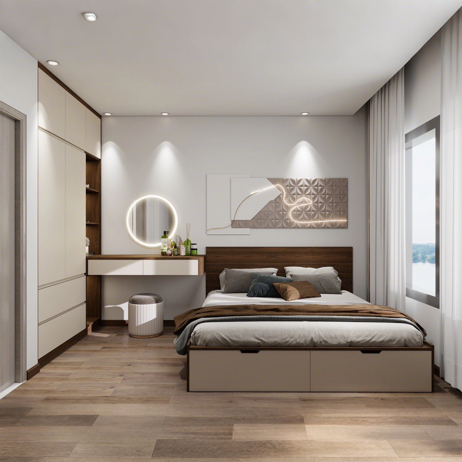 Subtle recessed ceiling spotlights and natural light reflections enhance the wood grain and highlight the smooth cabinet surfaces. The wardrobe connects visually with the walnut-toned headboard and bed base, delivering a cohesive, high-end look ideal for modern urban living.